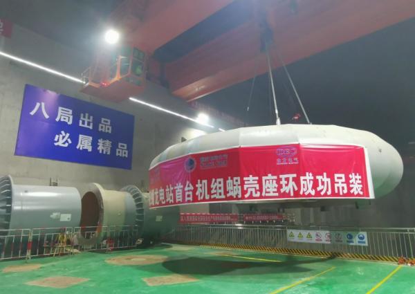 上午9點03分,現(xiàn)場總指揮發(fā)出“起吊”指令,首臺機組蝸殼座環(huán)在安裝間緩緩拔地而起,在地下廠房懸空穩(wěn)穩(wěn)前行67米之后,到達1號機組段上方。