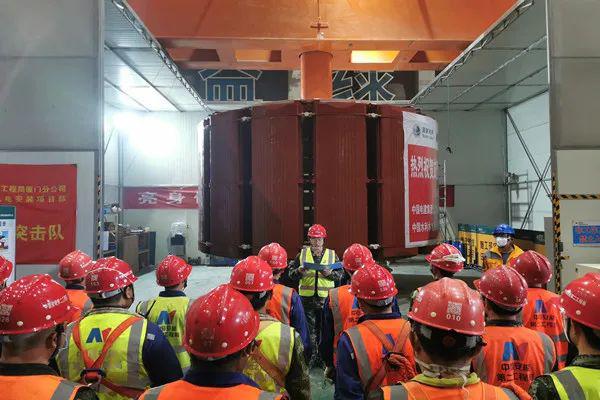 吊裝過程中,現(xiàn)場進行技術(shù)交底,相關(guān)人員各司其職、各盡其責,兩臺載重250噸的橋機通過平衡梁專用工具,吊起轉(zhuǎn)子,緩緩平移出工位棚,向著機坑方向移動,上機架、下機架處作業(yè)人員嚴格監(jiān)視著轉(zhuǎn)子進入定子的位置,配合調(diào)整方向、核對同心度,確保轉(zhuǎn)子準確吊入定子中心,經(jīng)過近兩個小時的連續(xù)奮戰(zhàn),2號機組轉(zhuǎn)子順利與發(fā)電機大軸緊密連接,順利吊裝成功。