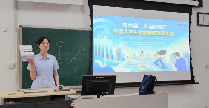 隨后,投資咨詢部分析師王大元為學生介紹了第六屆鄭商所杯模擬交易大賽,講解了期貨交易過程中出現的“加倉”“鎖倉”等概念,并對如何使用交易軟件進行了重點解讀,引導同學們在官網學習專區進行學習,鼓勵同學們踴躍參賽,爭創佳績。