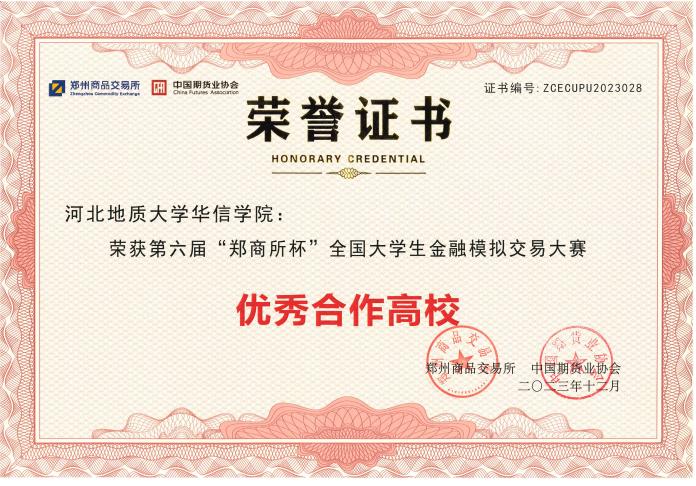 第六屆“鄭商所杯”全國大學生金融模擬交易大賽(簡稱:第六屆“鄭商所杯”)已經圓滿收官。近日,第六屆“鄭商所杯”獲獎名單對外公示。國富農業投資集團所屬子公司恒銀期貨有限公司(簡稱:恒銀期貨)對接的高校——河北地質大學華信學院榮獲第六屆“鄭商所杯”全國大學生金融模擬交易大賽“優秀合作高校”稱號。
