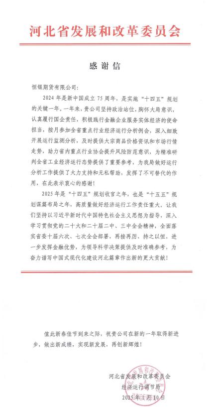 近日,河北省發展和改革委員會經濟運行調節局向恒銀期貨發來感謝信。信中對恒銀期貨踐行國有金融企業服務實體經濟的使命擔當、深入細致開展運行監測分析、及時提供大宗商品價格資訊和市場行情走勢、助力省內重點行業協會提升風險防范意識、協助研判全省工業經濟運行態勢等工作表示感謝,并對恒銀期貨2025年工作提出了期望和要求。