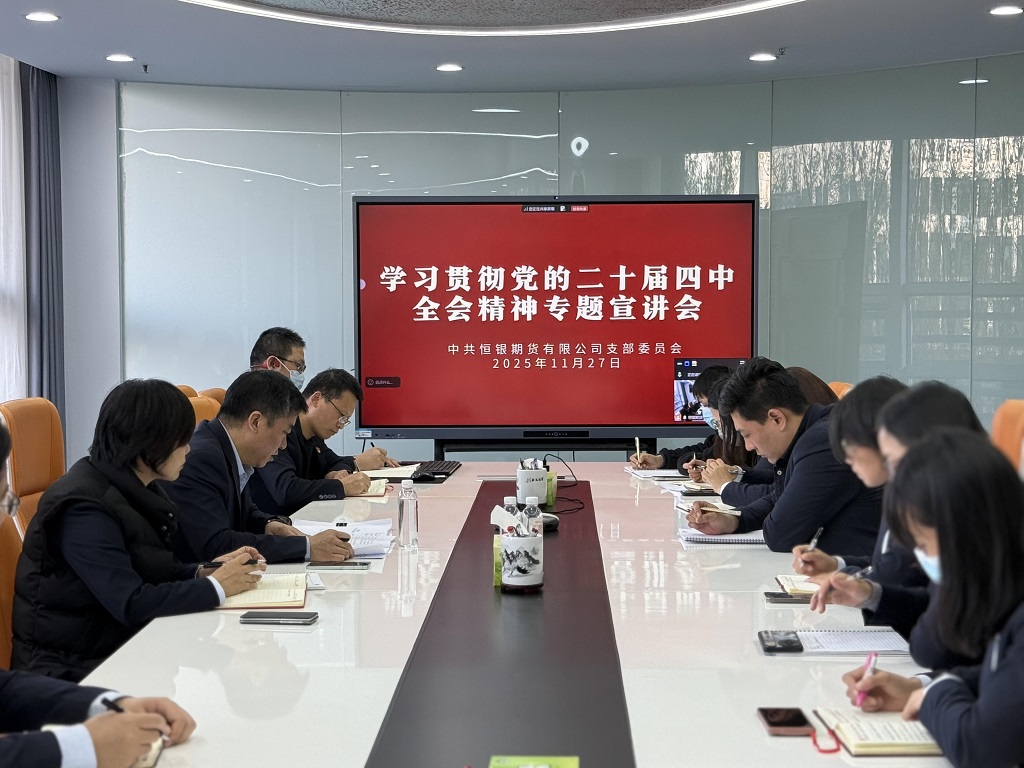 2025年11月27日,恒銀期貨有限公司在總部會(huì)議室設(shè)立主會(huì)場(chǎng),召開學(xué)習(xí)貫徹黨的二十屆四中全會(huì)精神宣講報(bào)告會(huì)。河北國富投資副總經(jīng)理、恒銀公司黨支部書記、董事長李剛作專題宣講,公司全體黨員和積極分子現(xiàn)場(chǎng)參會(huì),公司外地黨員及從業(yè)人員通過線上會(huì)議同步學(xué)習(xí)。