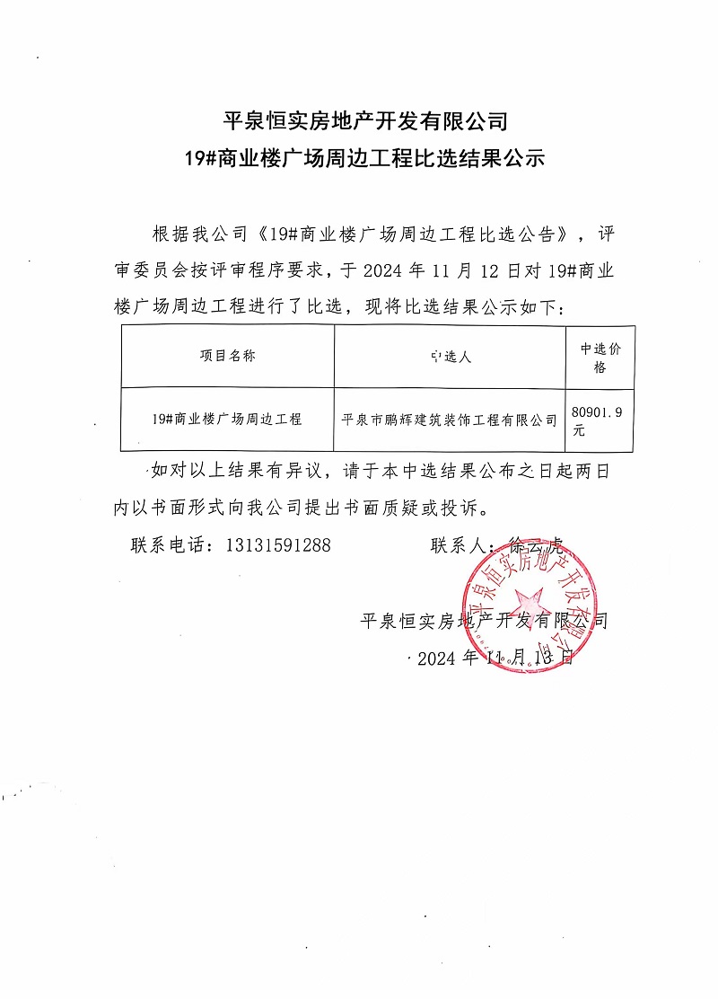 平泉恒實公司19#商業樓廣場周邊工程比選結果公示
