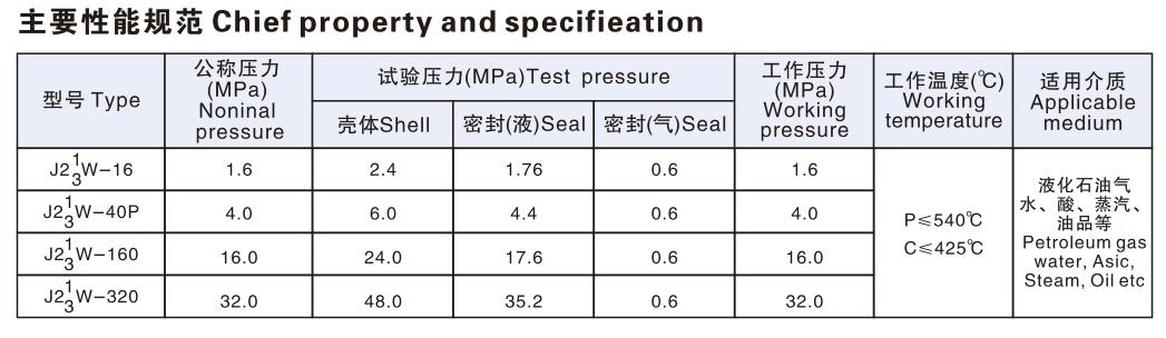 J13W-16 1.6 2.4 1.76 0.6 1.6 P≤540OC 液化石油氣水,酸,蒸汽,油品等